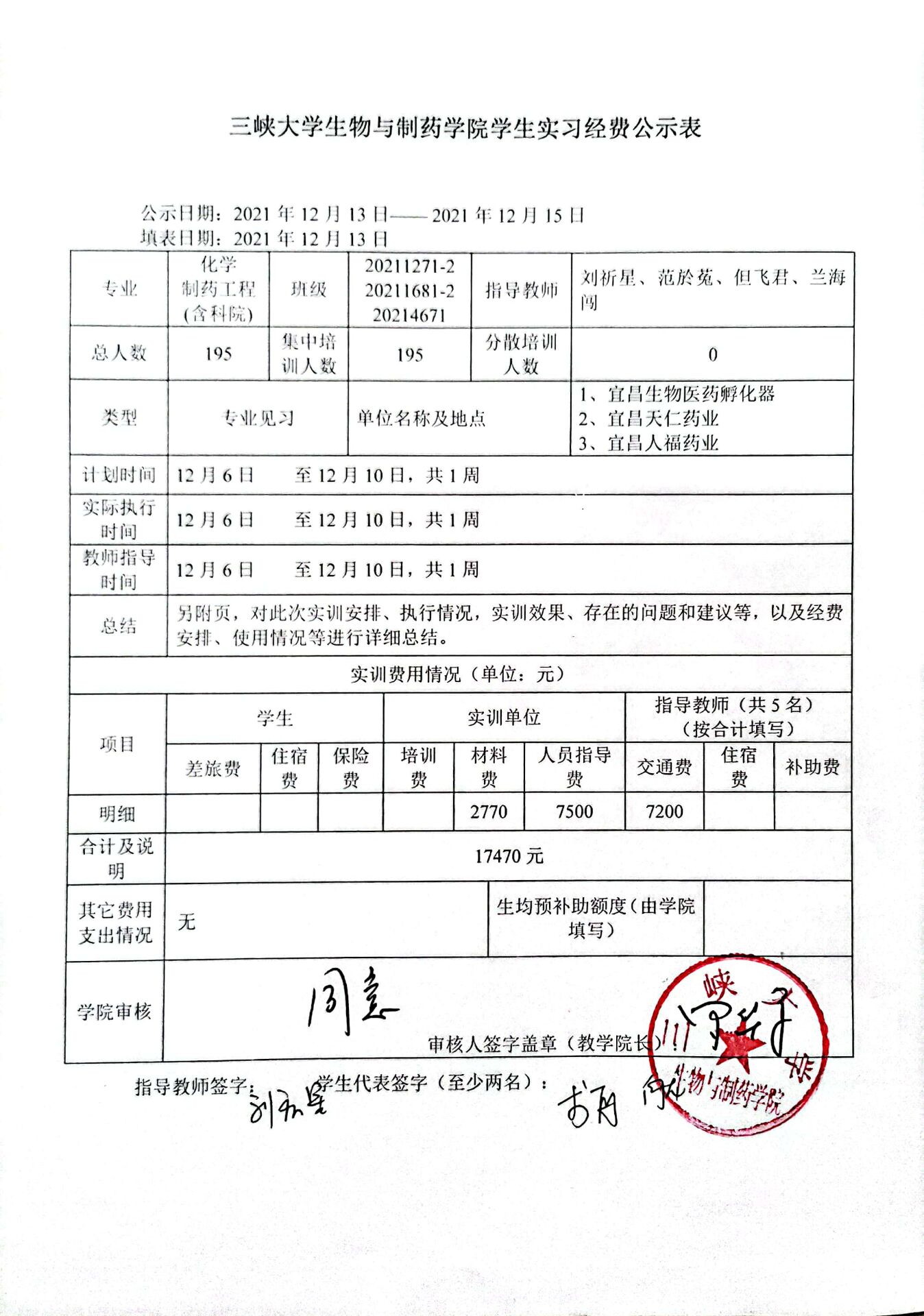 生药学院2021级化学、制药工程专业《专业见习》实习经费公示表