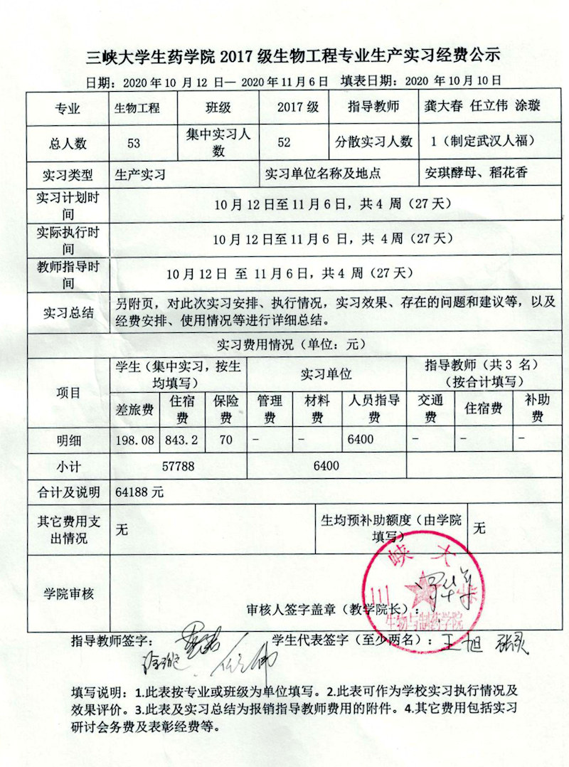 生药学院2017级生物工程专业生产实习经费公示