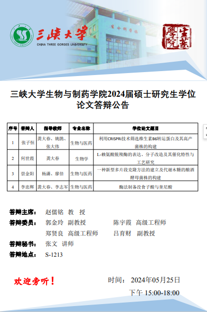 三峡大学生物与制药学院2024届硕士研究生学位论文答辩公告(十三)