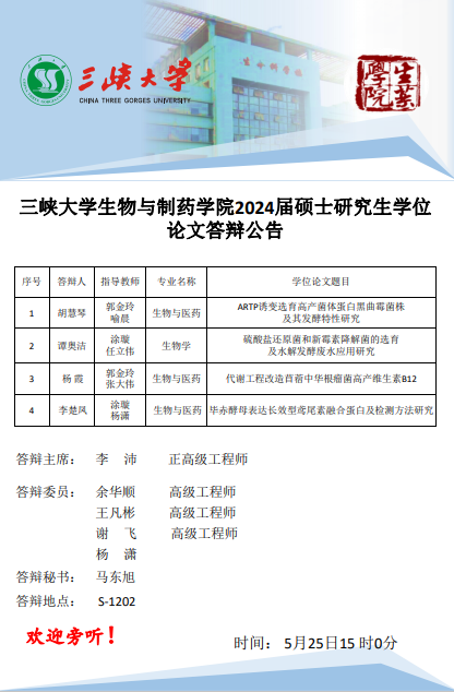 三峡大学生物与制药学院2024届硕士研究生学位论文答辩公告(十五)