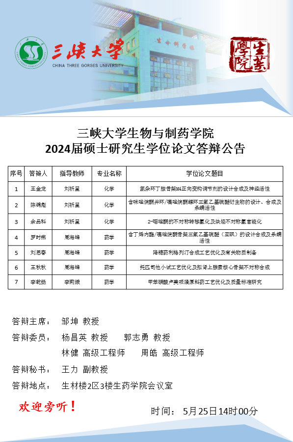 三峡大学生物与制药学院2024届硕士研究生学位论文答辩公告(四)