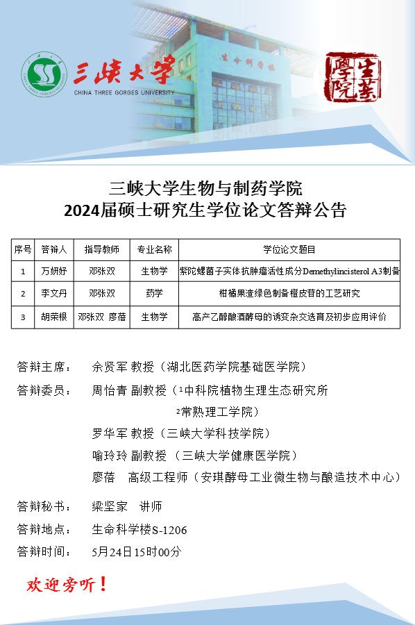 三峡大学生物与制药学院2024届硕士研究生学位论文答辩公告(十)