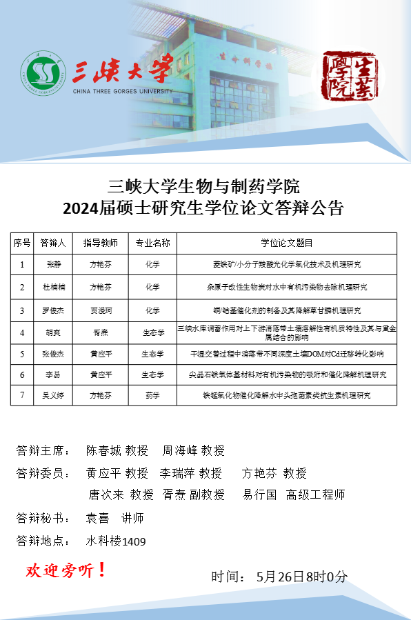 三峡大学生物与制药学院2024届硕士研究生学位论文答辩公告(七)
