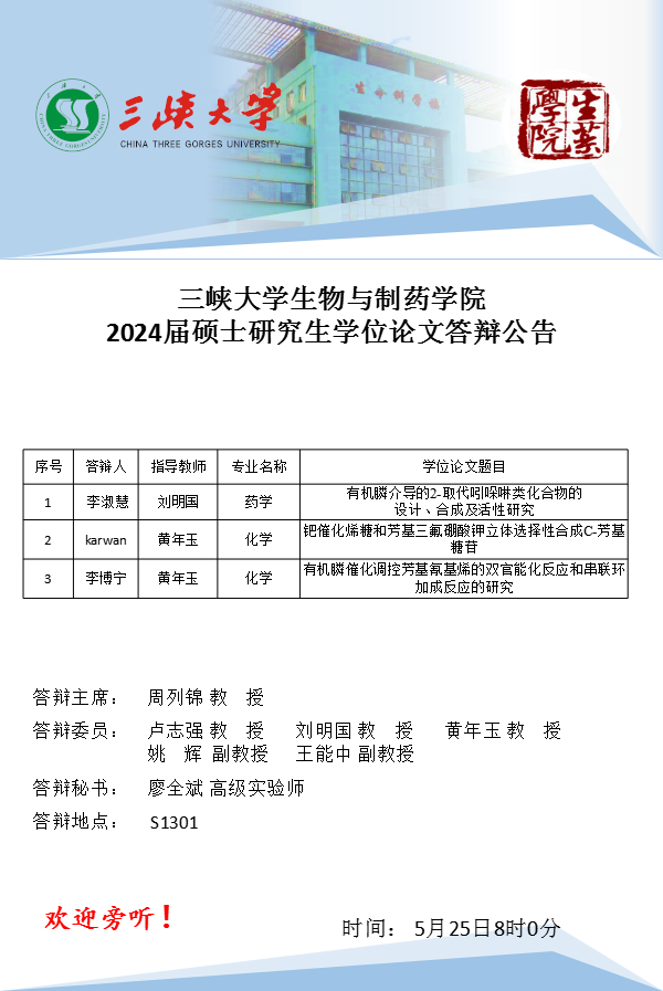 三峡大学生物与制药学院2024届硕士研究生学位论文答辩公告(三)