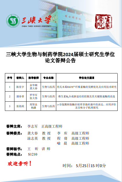 三峡大学生物与制药学院2024届硕士研究生学位论文答辩公告(十四)