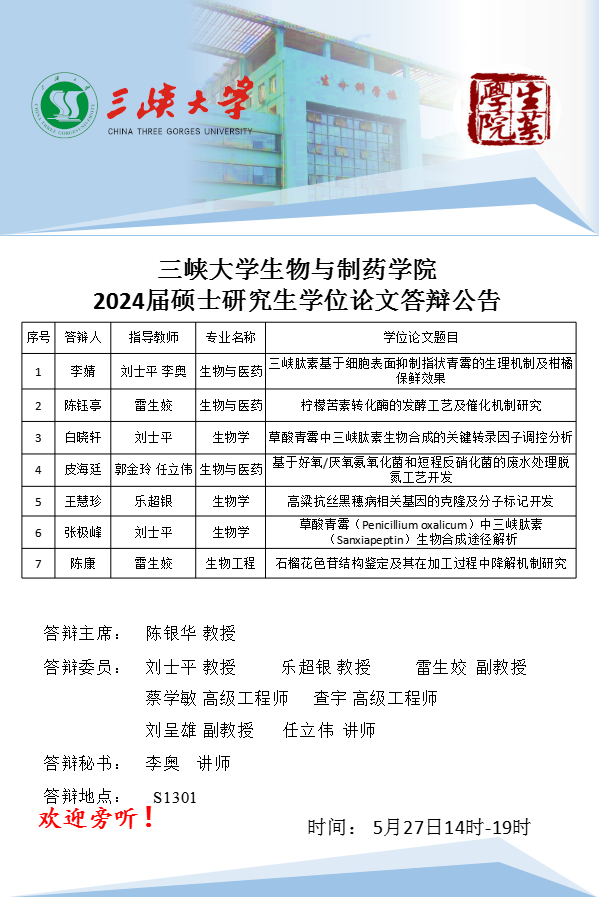 三峡大学生物与制药学院2024届硕士研究生学位论文答辩公告(六)