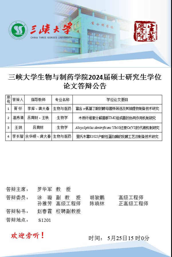 三峡大学生物与制药学院2024届硕士研究生学位论文答辩公告(十二)