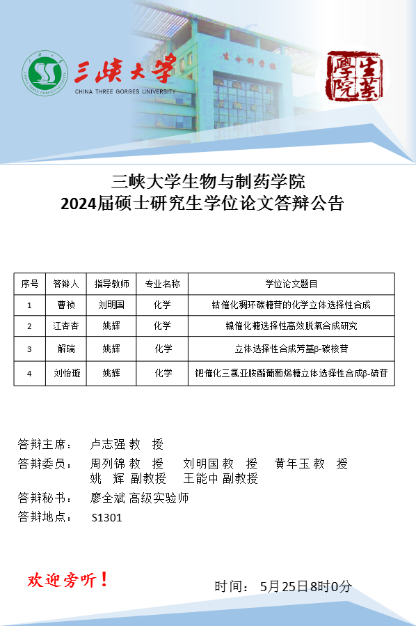 三峡大学生物与制药学院2024届硕士研究生学位论文答辩公告(二)