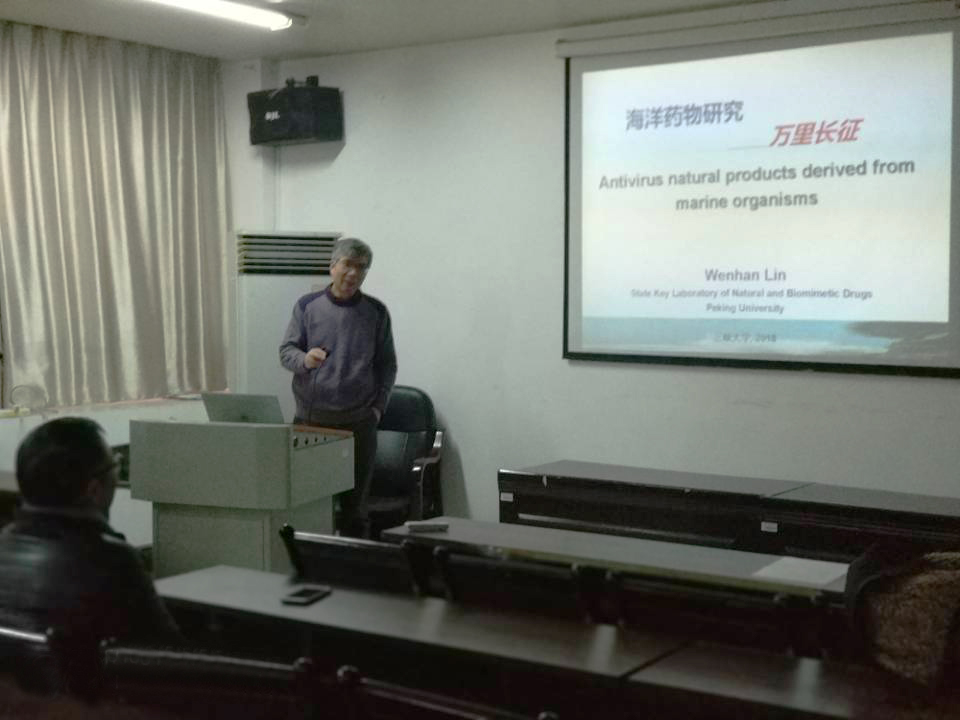 (图文来源/陈禹)2018年1月24日上午9点半,在我院大会议室室,来自北京大学天然药物及仿生药物国家重点实验室的林文翰教授为我院师生作了题为“Antivirus natural products drviced from marine organisms”的学术报告。报告由生物与制药学院副院长汪鋆植主持,天然产物实验室全体教师研究生参加了此次报告。