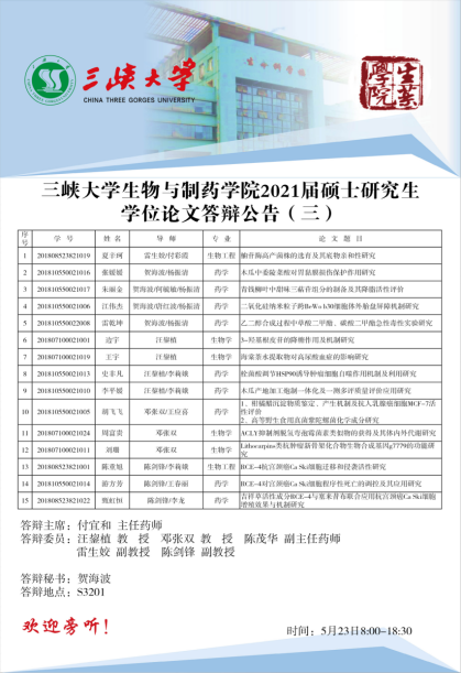 三峡大学生物与制药学院2021届硕士研究生学位论文答辩公告(三)