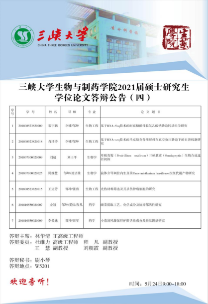 三峡大学生物与制药学院2021届硕士研究生学位论文答辩公告(四)