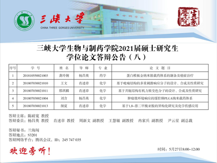 三峡大学生物与制药学院2021届硕士研究生学位论文答辩公告(八)