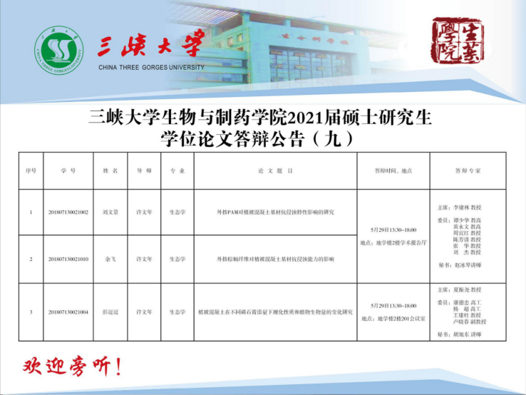三峡大学生物与制药学院2021届硕士研究生学位论文答辩公告(九)