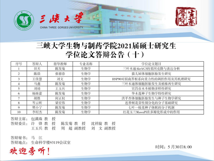 三峡大学生物与制药学院2021届硕士研究生学位论文答辩公告(十)