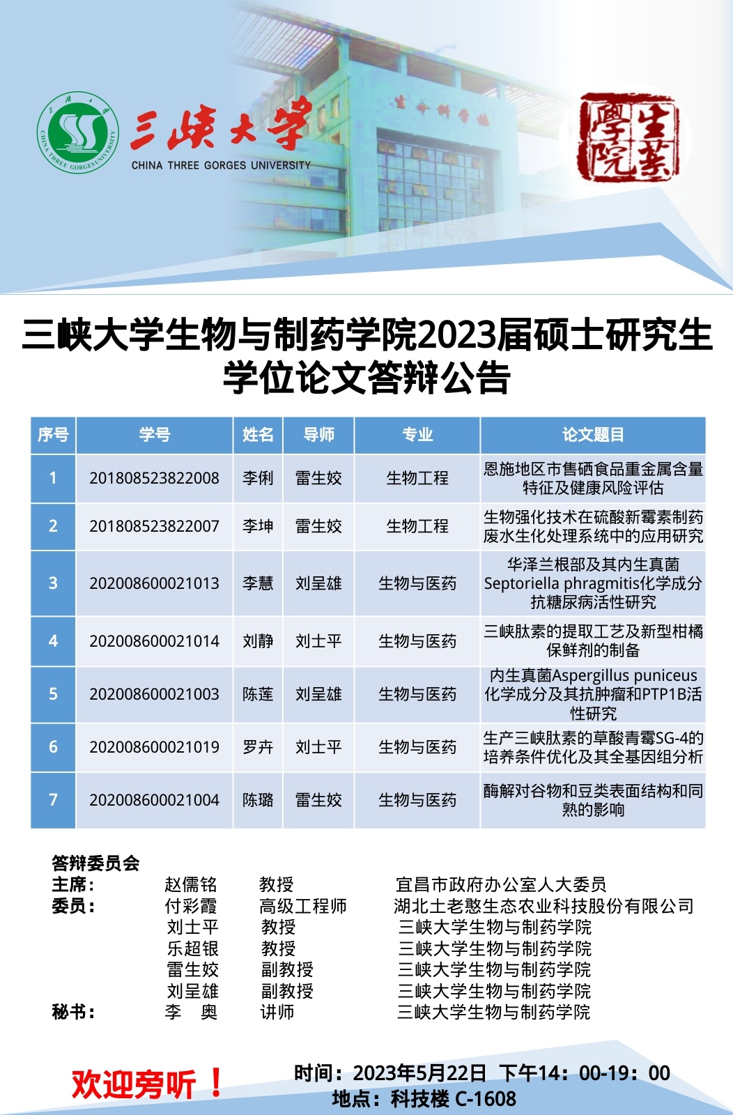 三峡大学生物与制药学院2023届硕士研究生学位论文答辩公告(二)