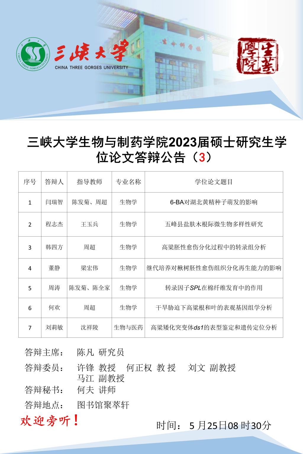 三峡大学生物与制药学院2023届硕士研究生学位论文答辩公告(三)