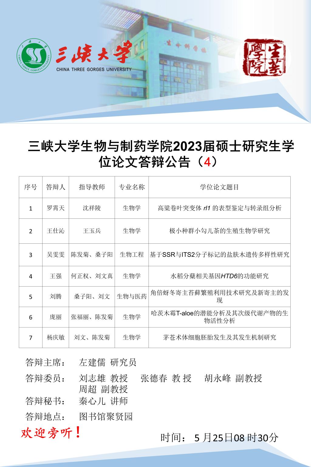 三峡大学生物与制药学院2023届硕士研究生学位论文答辩公告(四)