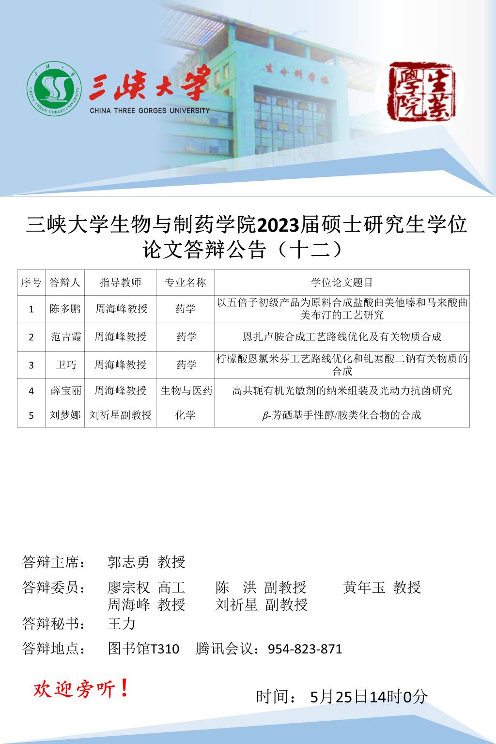 三峡大学生物与制药学院2023届硕士研究生学位论文答辩公告(六)