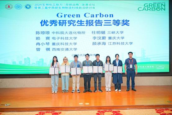 在专题一“合成生物学与细胞工厂”专题中,马冬旭博士作了《⾼性能近平滑假丝酵⺟羰基还原酶的分⼦改造》报告,王昕博士作了《Klebsiella pneumoniae在1,3-PDO⽣物合成中的TMT组学及代谢调控研究》报告,获优秀口头报告奖;研究生杜明樾参与研究生论坛,作《高产菌体蛋白米曲霉菌株的选育及发酵特性研究》报告,获优秀研究生论坛报告三等奖;研究生程前提交了墙报《The Proteomics and Related Metabolic Regulation for 1,3-Propanediol Production in Klebsiella pneumoniae》,获优秀墙报奖。