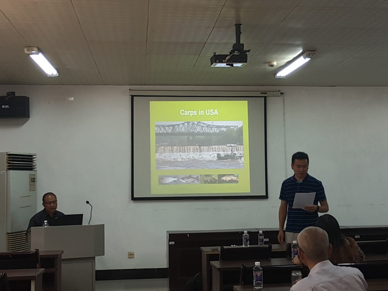 古滨河博士在报告上讲解:在美国,亚洲鲤泛滥,从外来引进为了控制水体藻类生物量,没有有效的控制手段而成为美国最大的入侵种之一;并且亚洲鲤并不仅仅是亚洲鲤鱼,而是鲤科鱼类。鲤科鱼类在美国近20多年来的分布以及扩散,在河道的繁殖快,种群密度大,食物来源重叠较高,严重影响本地的水生生态系统。会下古博士与我院师生进行大量的讨论交流,使我院师生受益良多。